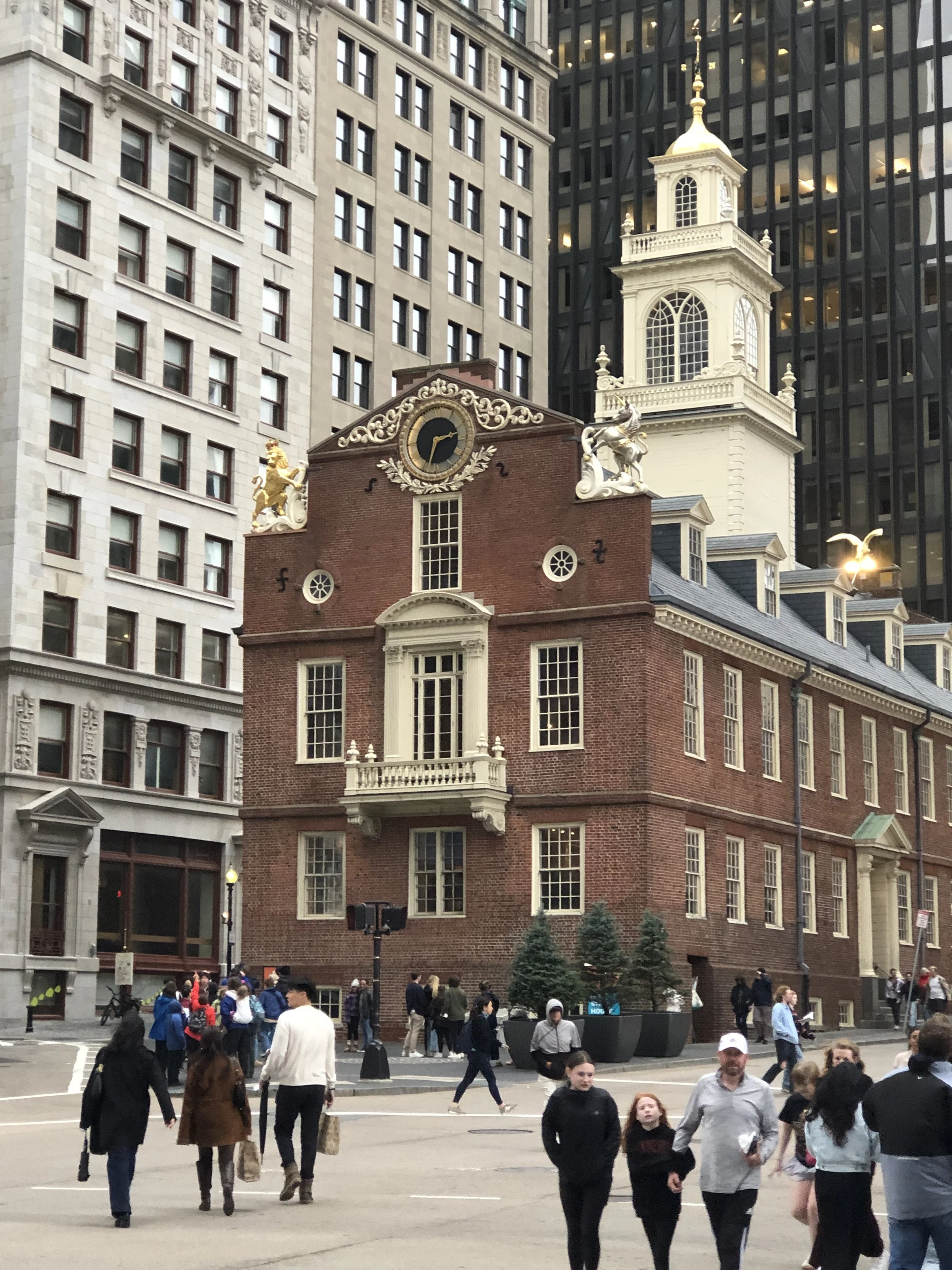 At the edge of one of the larger intersections we looked across at the Old State House, where the Boston Massacre took place in March 1770. There’s a lot more to it, but simply put, tensions had ramped up to the point where a mob of colonists taunted, throwing snowballs and rocks at the British “regulars” who fired into the crowd, killing 5.