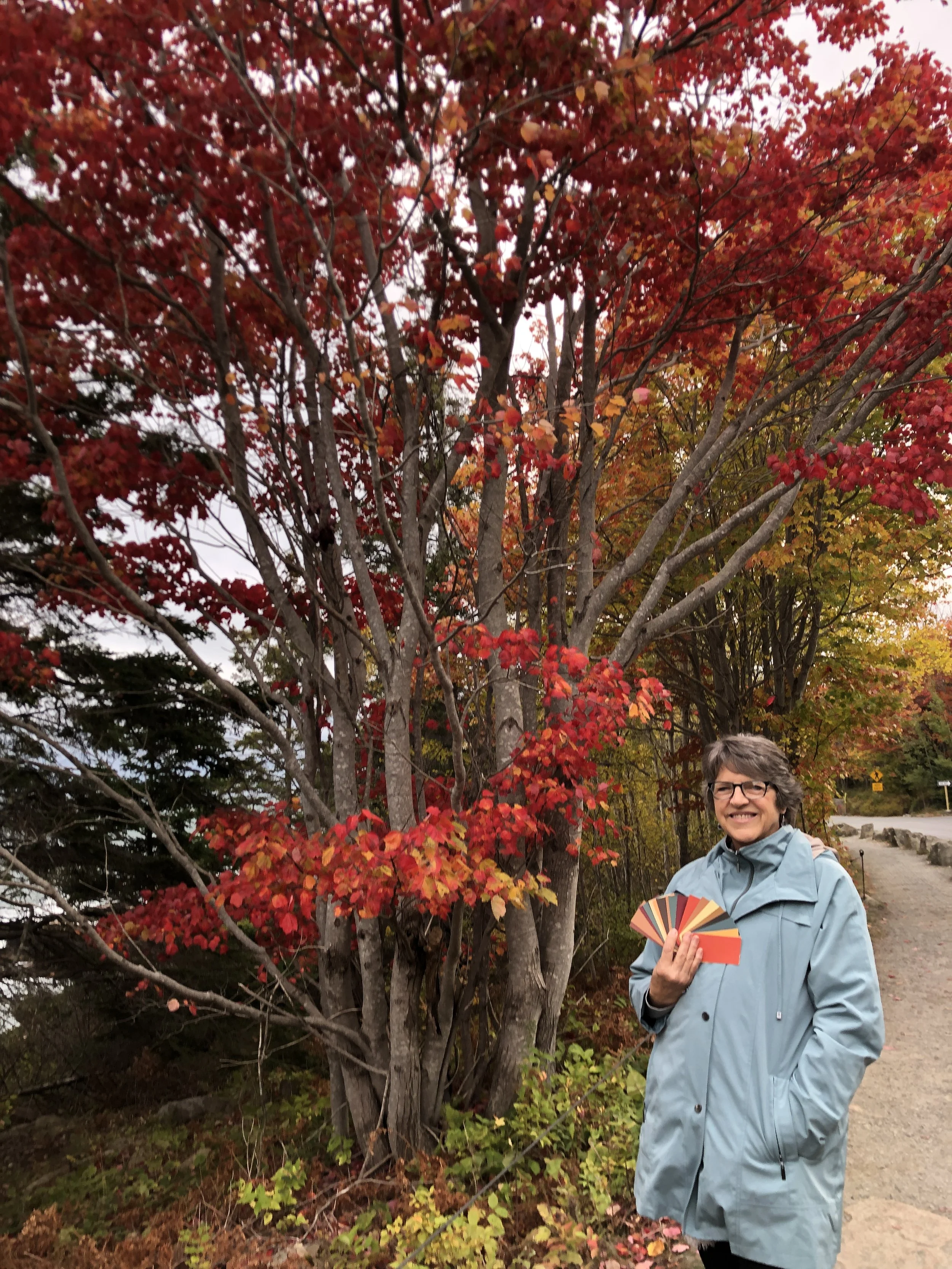 I posed with the colorful swatches, one of the aforementioned “birthday gift clues” from back in May. I stuck them in my coat pocket hoping for a good “matchup” and to prove that my girls delivered on their promise that fall colors would be included in my trip. Maine really delivered! Do I look tired in this photo? That’s because I was. We packed so much into one week, I knew I’d need a vacation from my vacation but I wouldn’t want it any other way!