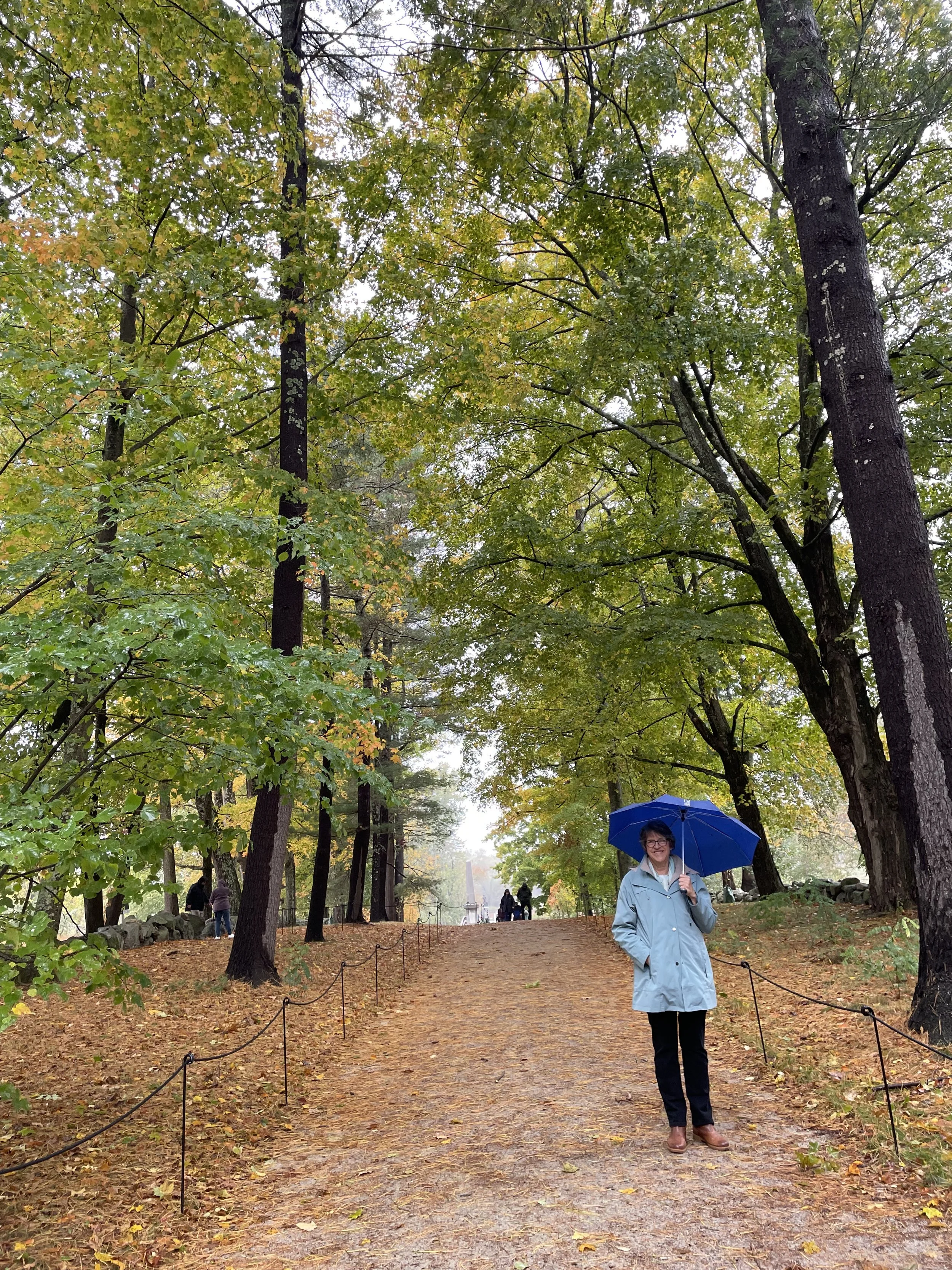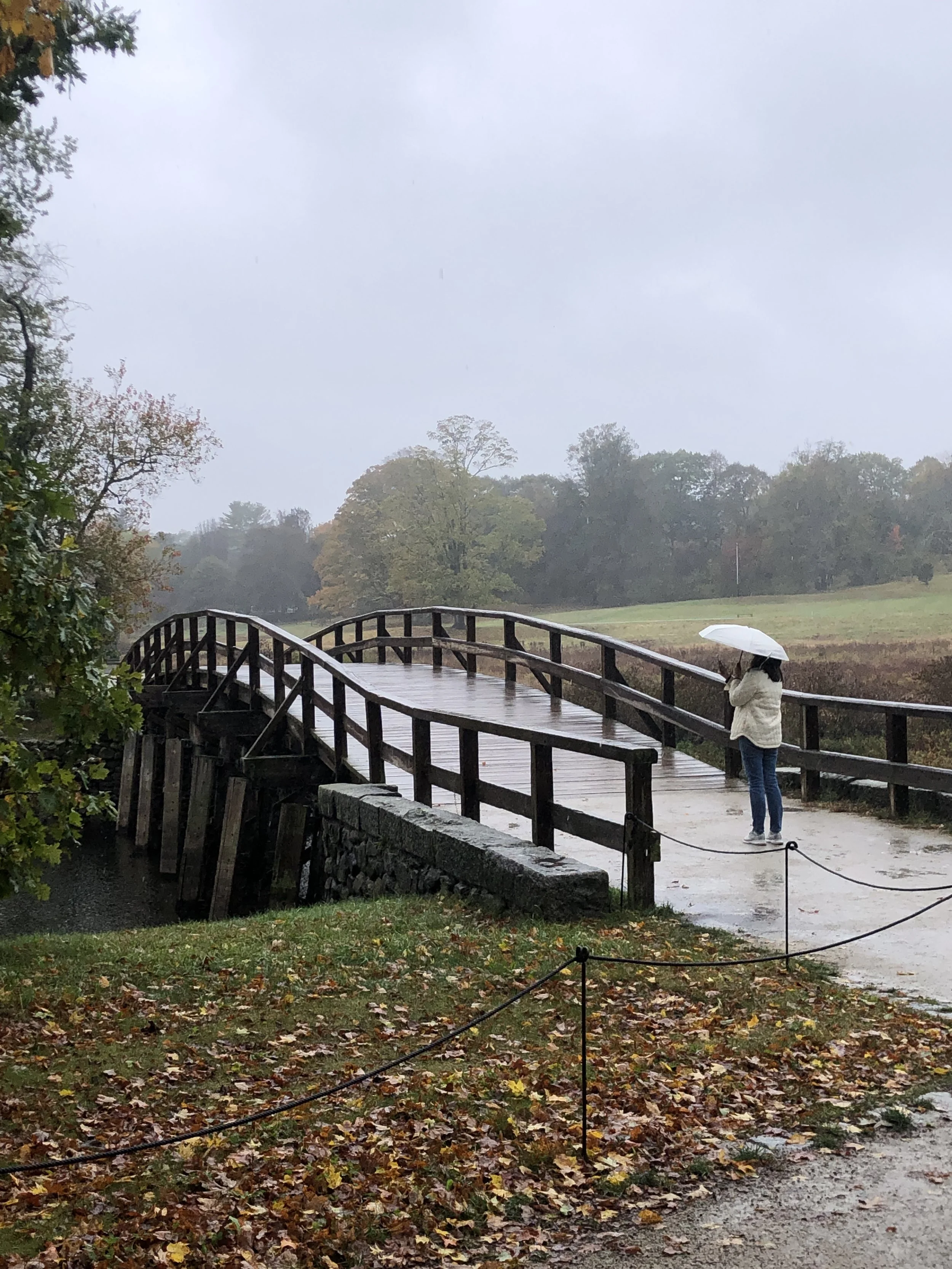 As the British “came by sea” and marched toward Concord, Paul Revere and others road ahead to warn the militia. Why Concord? The militia’s ammunition in Concord and patriot leaders, John Hancock and Samuel Adams in Lexington were the prizes. To keep it short, on the Lexington green redcoats fired on colonists, killing 8 and at the North Bridge, near Concord, for the first time, the colonists were ordered to fire back on the British Regulars, killing 3. This was “the shot heard round the world.” Standing on the manicured green, in the rain, surrounded by colonial homes, was surreal. In just about an hour we would be buying a coffee and pastry a few steps away. It is hard to imagine the emotions of all the people involved in this earliest conflict of the Revolution; The outnumbered colonists who faced the redcoats at Lexington Green, the clergyman’s widow who gave shelter to Revere, Hancock and Adams, the wife of Jonathan Harrington who watched her mortally wounded husband drag himself home and die at her feet in their doorway. What began with British Regulars arriving by “sea” and marching toward Concord, ended with the militia (4000 strong) engaging in battles all the way back to Boston, surrounding the city and laying siege. The general area between Lexington and Concord is called “Battle Road” and it was here, in the course of one day, April 19, 1775, the Revolutionary War began. For us, it was quiet, drizzly, quite beautiful and void of visitors, especially at the North Bridge. Here especially, with no cars, stores or modern homes nearby it was easy to picture the original conflict.