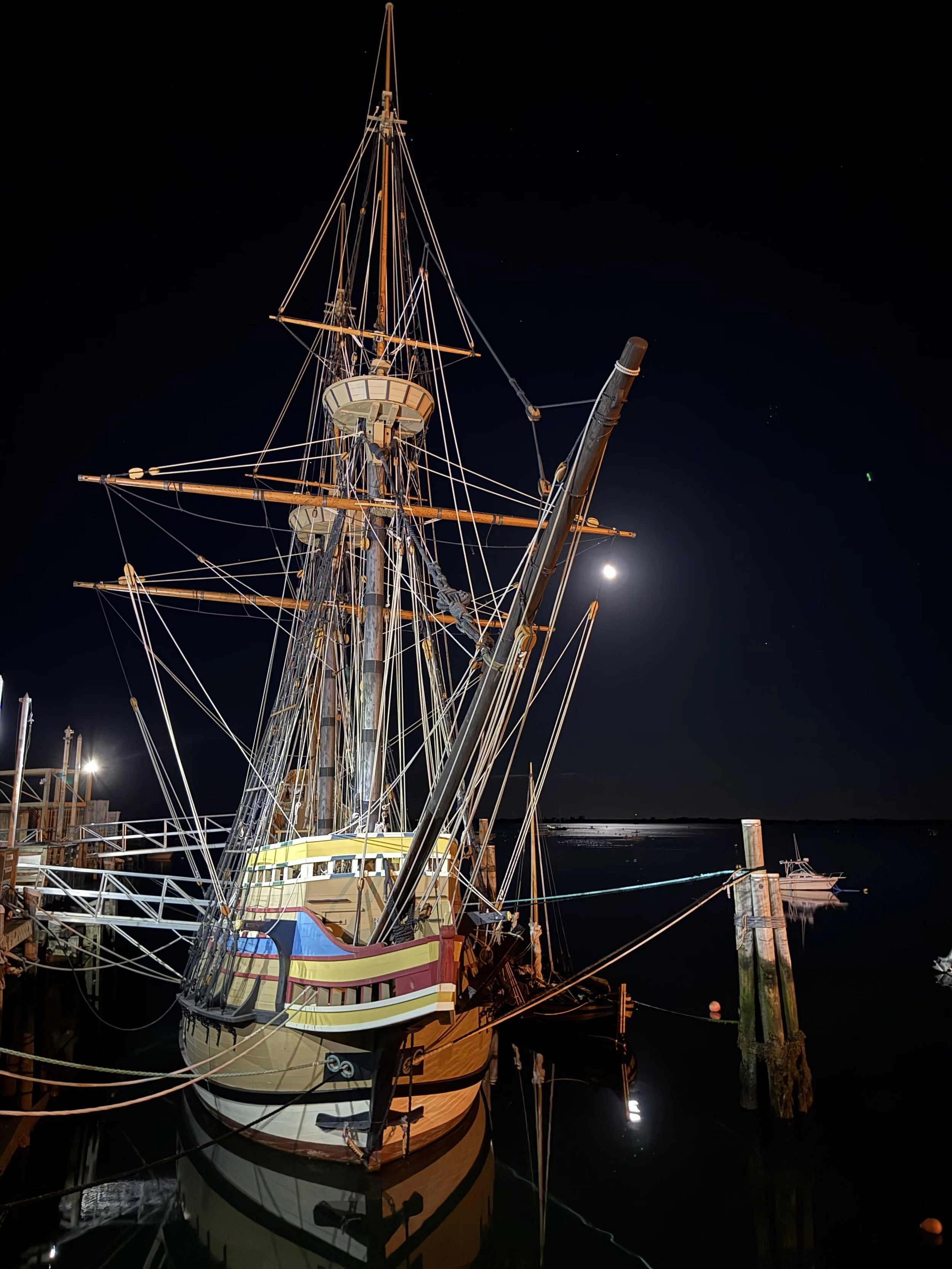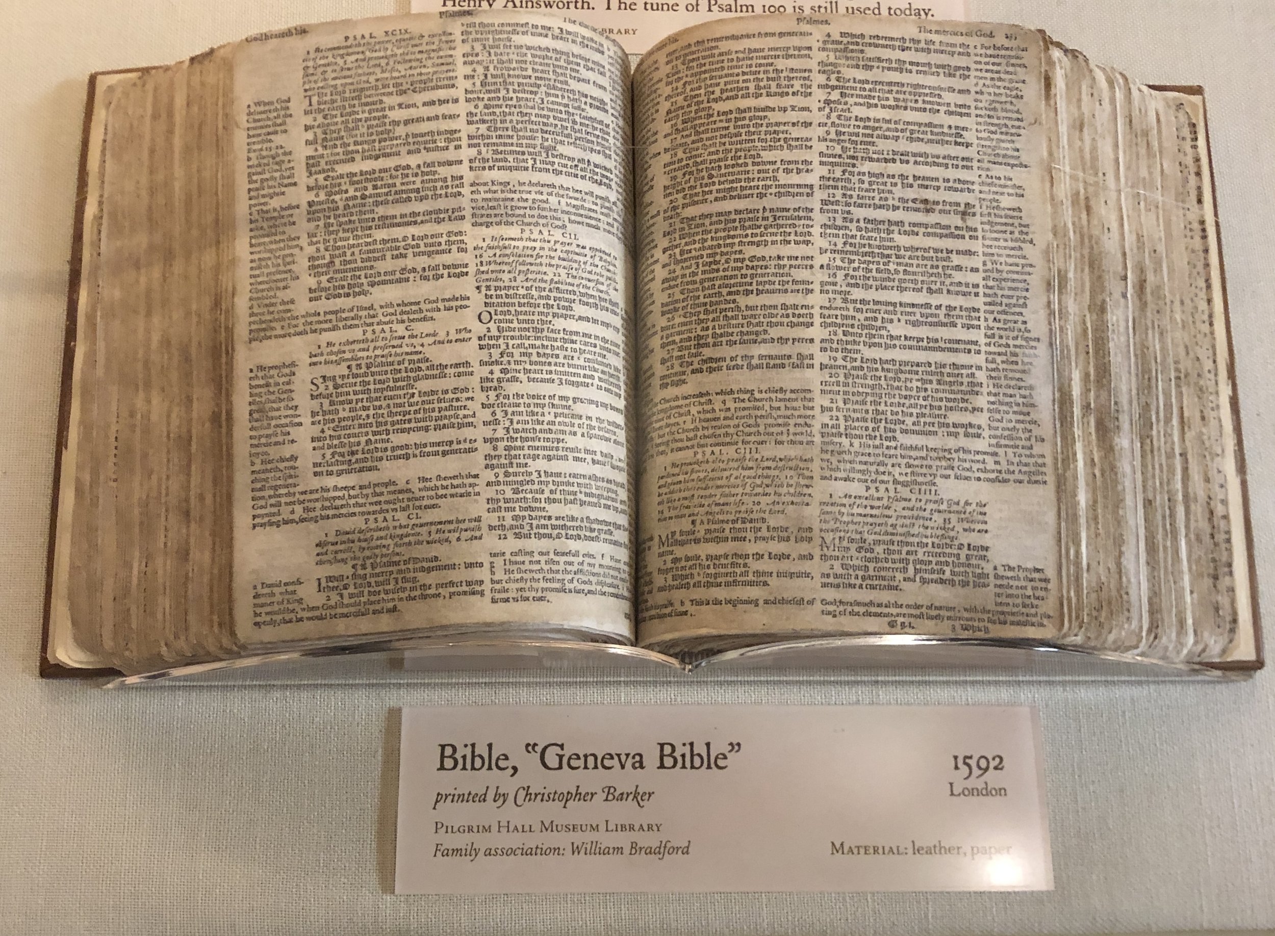Starting at the beginning of our vacation, AND the beginning of our American family, here’s where the “Mary” clue comes in. I’ve long been teased by my family about how often I mention that we descend from the Isaac Allerton family and their daughter, Mary Allerton, who traveled across the Atlantic in 1620. 4 year old Mary was the youngest child on the Mayflower voyage other than a baby born to another family. Her mother died on board, in the harbor, months before the women and children came ashore. We all know about the brutal winter and loss of half of the passengers to illness and the elements during that first year, and the first thanksgiving right there in Plymouth. We stood on the street where they lived, looked out the window of our Airbnb on Town Brook that supplied them with fresh water, stood on the same piece of land where Thomas and Mary raised their family, visited their graves on Burial Hill and had lunch overlooking the famous rock and the replica, Mayflower II. It was surreal to see my 8th great-grandmother’s wooden cup and William Bradford’s Geneva Bible, items that came across on the Mayflower in 1620 and and passed down through families to the Pilgrim Hall Museum.