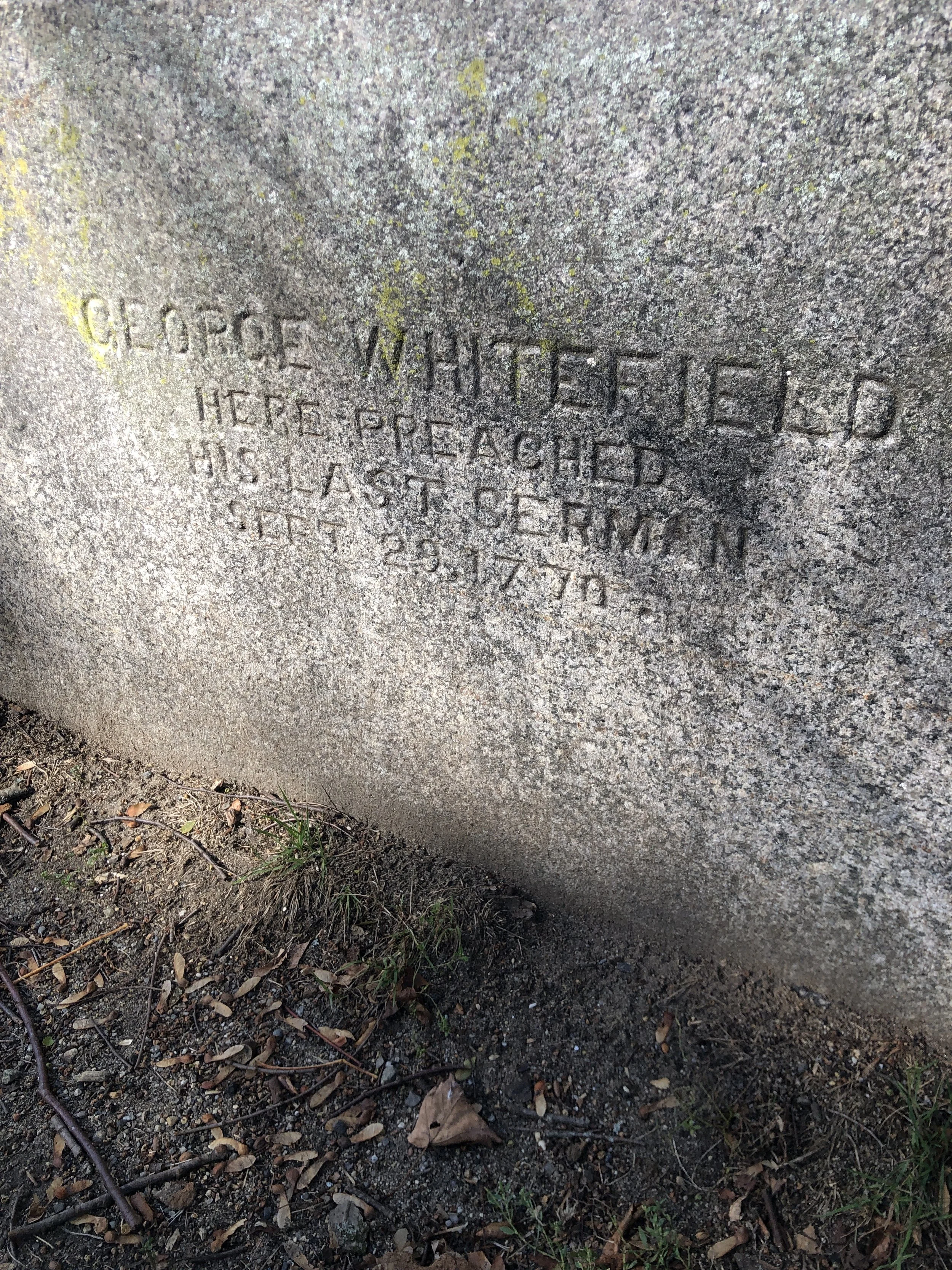 Traveling from Portsmouth, NH, traveling to Newbury Port, MA, 28 miles on horseback, while very sick, on his way, he was entreated to preach in the town of Exeter, NH. It would be his last complete sermon preached in his typical fashion for 2 hours to a very large crowd outdoors. In his sermon he exhorted them to “Test yourselves to see if you are in the faith; examine yourselves!” from 2 Corinthians 13:5. After a meal, he made his way to Newbury Port, MA where he had planned to preach on Sunday, but he died in the night. We stood on the sight of his last sermon, outside the house where he died, and stepped inside the church where he is buried. I have heard of George Whitefield for years, but after walking in his last few steps I want to learn more about him.