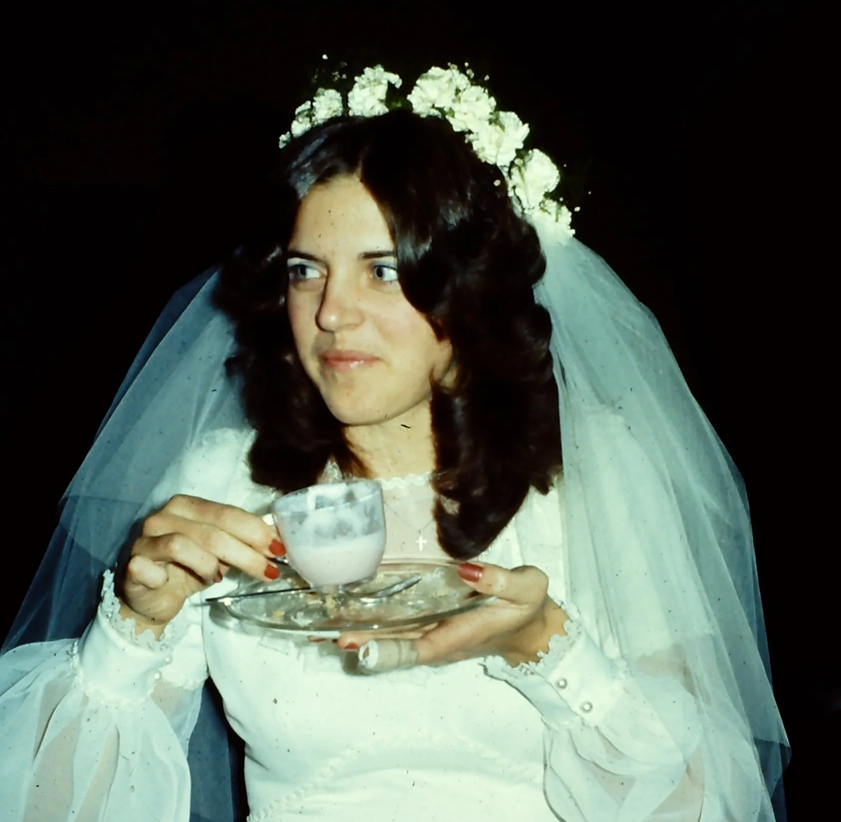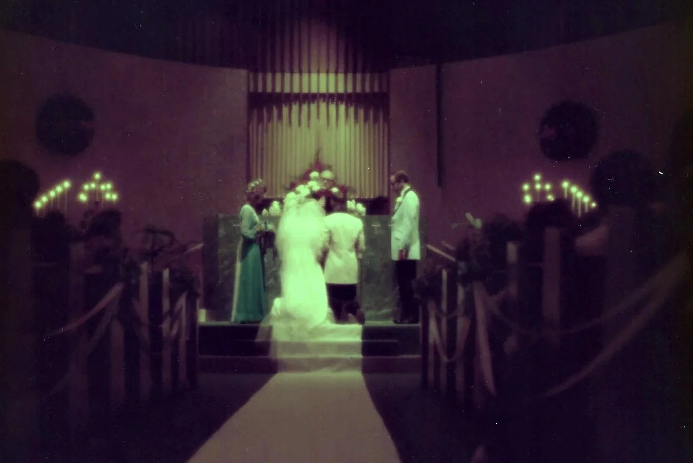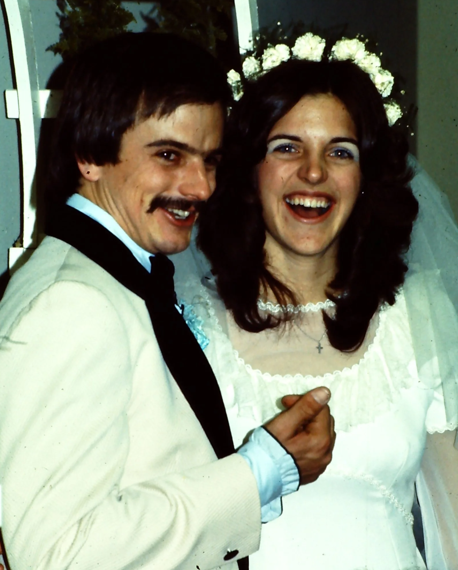 I had fun looking at the photos of the mid-70s styles that seemed so perfect at the time. And there were mishaps too. I almost took a trip to the ER on the day of my wedding. See my bandaged finger in the photo? One of my bridesmaids and I were making ham sandwiches for an early lunch on my wedding day, and slicing the leftover Christmas ham, too excited or just plain klutzy, I sliced toward my left hand and cut my finger. I probably should have gotten stitches, but that would have seriously messed up the day, so Vicki and I used direct pressure, and wrapped it tightly with bandaids. 51 years later I still have the scar if you want to see it. I survived, and was so overjoyed at marrying my sweetheart that it didn’t matter. Thank goodness for being able to carry a bouquet, so no one knew, and this is the only photo I know of that showed it. The worst part was everyone at the reception looking at my new ring, and squeezing my fingers! Yikes!