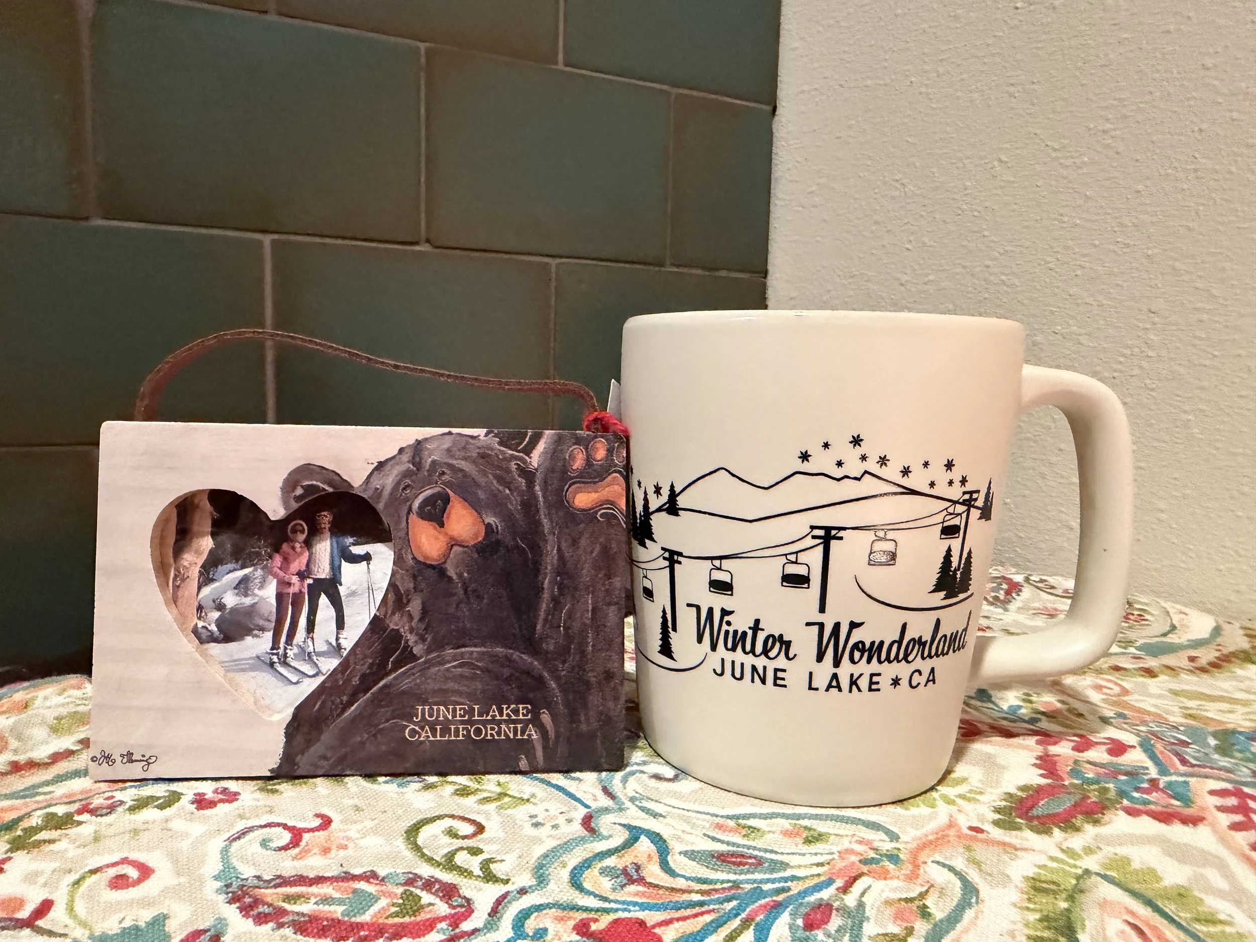 Our reception was very simple, just cake, punch and coffee right there at the 1st Baptist Church. We spent our wedding night in our Sunland home, and woke up to snow on the mountains! Perfect for a skiing honeymoon trip. Gary was a wonderful husband and of course I miss him, but since he died I rarely cry over losing him. As I’ve said in the past, Gary departed slowly with 9 years of Alzheimers, so most of my grieving was during those years. When he finally passed into glory, my grief turned into peace and joy. But every once in a while, I’m struck with the emotion, usually when I least expect it. For Christmas this year, Sarah and Ryan gave me a mug and an ornament from June Mountain where we had a few days of skiing on our honeymoon. When I opened it, I wept tears of missing Gary and thankfulness for the reasons I do.